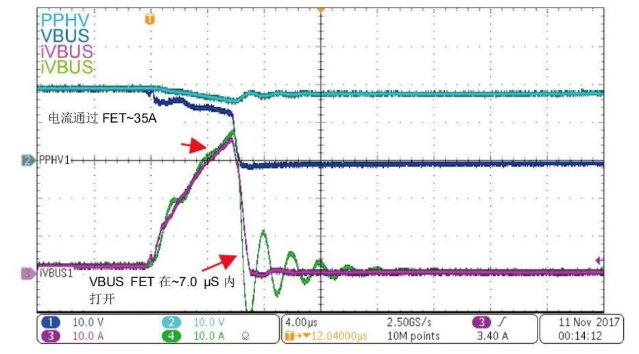 圖4重點說明了在具有適當保護的電源路徑的VBUS對地短路期間會發生的情況。當VBUS上的電流迅速上升至約35 A時,USB PD控制器檢測到此大電流并立即斷開FET。VBUS對地短路保護必須通過硬件比較器作為固件來實現。固件實現無法足夠快速地做出反應以保護電源路徑和系統,這種電源路徑快速關斷可在發生硬短路時保護系統和FET。