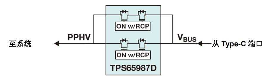 根據 USB PD 協議,在其配置通道(CC)線路上帶有RD 的設備必須將 DC/DC 控制器的輸出電容與 VBUS 隔離。在這種情況下,系統必須具有 VBUS FET 以滿足此協議。TPS65987D 有兩個高壓背對背集成 FET,可滿足此要求。TPS65987D 中的內部 FET 在 25°C 環境溫度下的 RDS(on)約為 25mΩ。對于高電流應用,此電阻可能太高。當 5 A 的電流通過其中一個內部 FET 時,FET中將消耗大約 750 mW 的功率。通過雙電源模式,TPS65987D 能夠同時并聯關閉其兩個內部電源路徑。這種模式有效地將電源路徑的 RDS(on)減半,并且還使FET 內部的功耗減半。圖 3 重點說明了 PD 控制器如何與此電源架構連接。