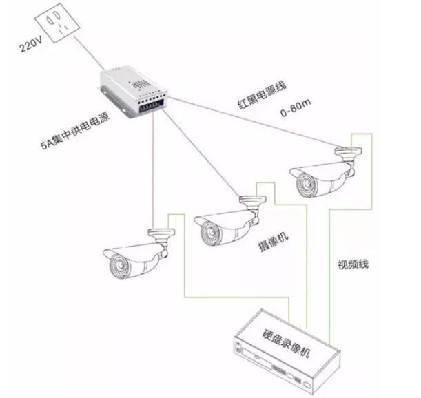 通常懂的人都知道集中供電模式是在 220V 電源處接 12V 集中電源一個,再用 2*1.0 紅黑電源線分別接給攝像頭,12V 供電距離不可超過 100 米。在接個單個電源線接頭,再把單個電源線接頭和監控攝像頭電源接頭相連接即可。集中供電方式是指在監控室或某個中間點采用 12V 開關電源向前端負載集中供電。與獨立供電模式相比,最大的差別在于一個電源可以為多個攝像機提供電力供應。
