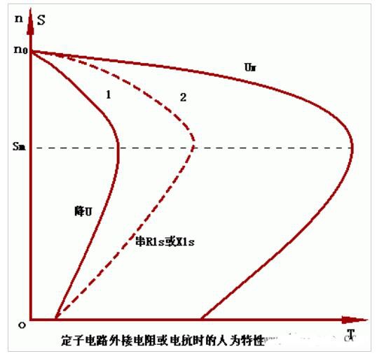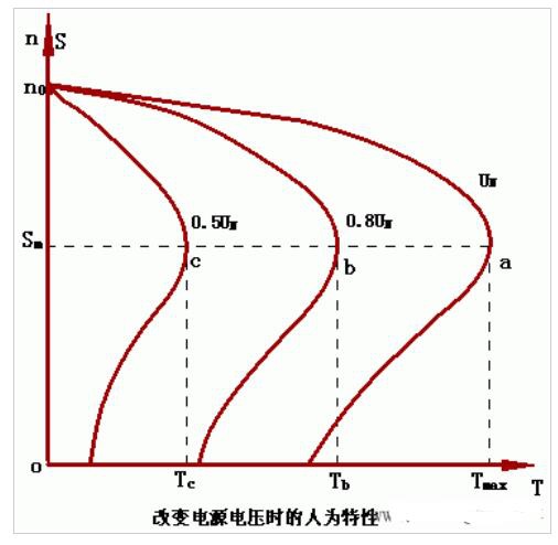 電壓U的改動(dòng)對(duì)志向空載轉(zhuǎn)速no和臨界轉(zhuǎn)差率Sm不發(fā)作影響,但 轉(zhuǎn)矩Tmax與U2成正比,當(dāng)下降定子電壓時(shí),no和Sm不變,而Tmax大大減小。