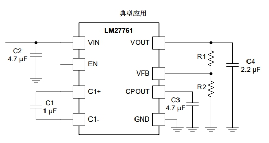 為了解決電荷泵芯片產(chǎn)生的負(fù)電源軌紋波大的問(wèn)題,德州儀器在 LM2776 的基礎(chǔ)上發(fā)展出了內(nèi)部集成了一顆負(fù) LDO 的電荷泵芯片, LM27761。下圖為 LM27761 的典型應(yīng)用示意圖: