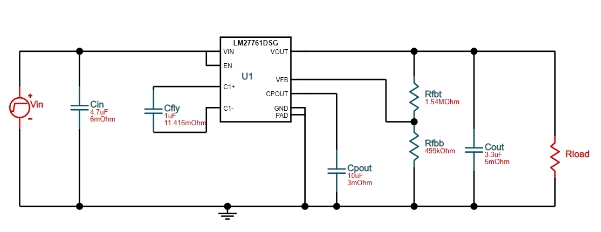 您還可以通過(guò)使用 TI 免費(fèi)在線(xiàn)仿真軟件 WEBENCH 來(lái)創(chuàng)建 LM27761 的定制設(shè)計(jì),進(jìn)行線(xiàn)上仿真,生成可導(dǎo)出的 PCB 文件及核算 BOM。如下方為使用 WEBENCH 設(shè)計(jì)出來(lái)的 LM27761 參考電路,VIN=5.5V, VOUT=-5V, IOUT=50mA。