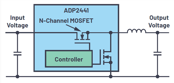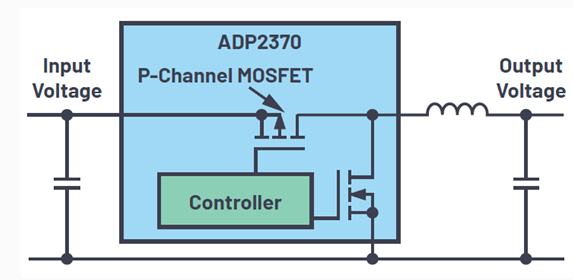 圖 3 所示為開關(guān)穩(wěn)壓器 ADP2370,該穩(wěn)壓器通過將 P 通道 MOSFET 用作高壓側(cè)開關(guān)來實(shí)現(xiàn) 100%占空比。對(duì)于這種類型的降壓轉(zhuǎn)換器,輸入電壓可以降低至非常接近輸出電壓。將 P 通道開關(guān)集成到開關(guān)穩(wěn)壓器中,可以避免產(chǎn)生額外成本。