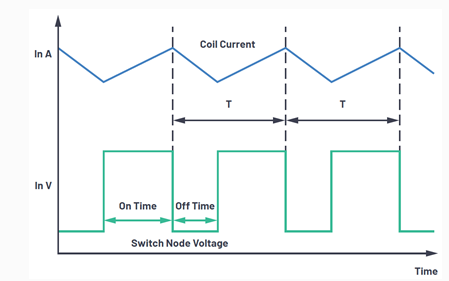 圖 2. 降壓型開關(guān)穩(wěn)壓器開關(guān)的時(shí)域表示(CCM 模式下線圈電流)。