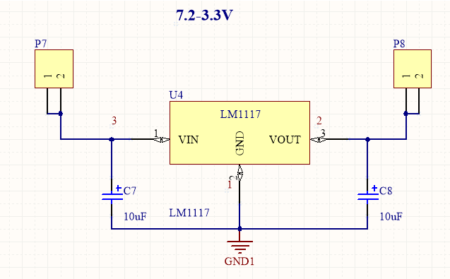 7.2v轉3.3v用lm1117效果挺好的,電路如下: