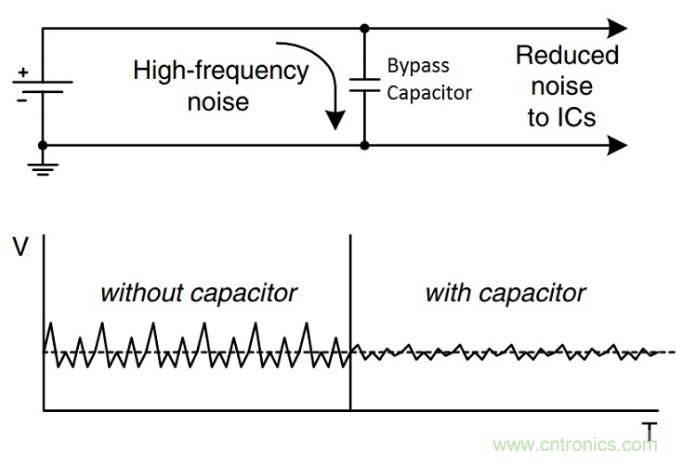 來自電源的噪聲(規則的尖峰脈沖)是不希望的,必須不惜一切代價消除。旁路電容器是防止電源上有害噪聲的第一道防線。