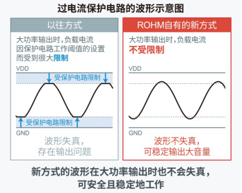 新產(chǎn)品“BD783xxEFJ-M”搭載了這一新型過電流保護電路,可切實保護IC免受負(fù)載短路影響,且在輸出大功率時也不會出現(xiàn)失真的情況。