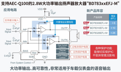 ROHM開發(fā)出兼具大功率輸出與安全性,完美解決這一問題的車載儀表盤用揚聲器放大器“BD783xxEFJ-M”。該系列產(chǎn)品以儀表盤中需求最多的5V電源運行、且輸出功率1~2W為主要目標(biāo),輸入方式采用了模擬輸入,輸出方式采用了元器件數(shù)量較少的AB類。該系列產(chǎn)品具備如下所示的三大優(yōu)勢。