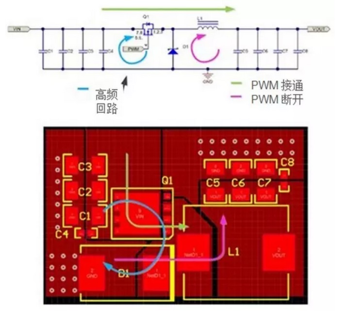 除了這些基本的布局規則,我通常首先會識別開關回路,然后確定哪些回路具有高頻開關電流。圖1所示為針對降壓電源(原理圖和布局)的簡化功率級的一個示例。