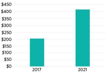 升壓轉換器為轉換器,其輸出電壓高于源電壓。縱觀升壓轉換器市場,根據行業分析數據,VIN (5V)升壓電源管理電路增長最快(圖3所示為全球升壓轉換器市場的營業額預測)。根據推動這種增長的IoT應用的要求,設計師正在尋求能夠提供較低電壓軌、較長電池壽命以及較小方案尺寸的升壓轉換器。