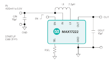 Maxim現在提供DC-DC升壓轉換器,擁有超低靜態電流(300nA)和真關斷(True Shutdown™)技術,可理想用于要求長電池壽命的電池供電應用。MAX17222 nanoPower升壓調節器具有0.5A峰值電感電流限值(圖4)。器件采用真關斷技術,輸出與輸入斷開時,無正向或反向電流。輸出電壓可由一個1%標準電阻選擇。MAX17222擁有啟動后使能瞬態保護(ETP),根據負載電流的不同,當輸入電壓下降到400mV以下時,允許輸出保持在范圍之內。升壓轉換器采用8 x 1.4mm2、6焊球WLP封裝和6引腳uDFN封裝,峰值效率高達95%,最大程度減少散熱。
