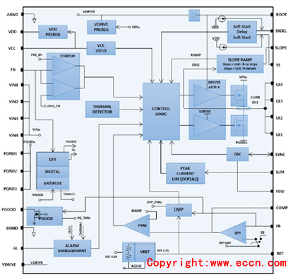 ST公司的RHRPMPOL01是單相降壓單片開關(guān)穩(wěn)壓器,集成了高精度內(nèi)部基準(zhǔn)電壓和用于同步轉(zhuǎn)換的功率MOSFET.器件采用SOI技術(shù),對單粒子閂鎖效應(yīng)有良好的性能.RHRPMPOL01能輸入電壓3.0V到12V轉(zhuǎn)換成 8V到0.85xVIN輸出電壓.設(shè)計用在空間應(yīng)用的FPGA,DSP,MCU和ASIC的電源.器件的控制器是基于峰值電流架構(gòu),從而保證了快的負(fù)載瞬態(tài)響應(yīng)和很穩(wěn)定的開關(guān)頻率.嵌入的積分器補償由于輸出電壓波紋所引起的DC電壓誤差.故障管理包括非閉鎖輸出過壓保護,過流保護和自動恢復(fù)的熱保護.輸出電流高達(dá)7A,工作溫度-55 C 到 +125 C,可編開關(guān)頻率從100kHz到1MHz.RHRPMPOL01總離子劑量為100 krad,無單粒子閂鎖效應(yīng)高達(dá)70 MeV/mg/cm2 (@ VCC up to 7 V),SEU-SEFI特性高達(dá)VCC 7V,無質(zhì)子.主要用在空間應(yīng)用的點負(fù)載穩(wěn)壓器,FPGA,DSP,CPU和ASIC電源以及低壓高密度分布電源系統(tǒng).本文介紹了RHRPMPOL01主要特性,框圖,典型應(yīng)用電路圖及其