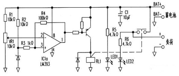這個電路的結構比較簡單,使用一個片常用的電壓比較器芯片-LM393。這是一個雙電壓比較器芯片,在這個電路中使用了其中的一片。這個電路的工作原理是:蓄電池除了給負載部分供電外,還會給這個電路提供電源。電壓比較器的同相輸入端由電阻R2通過穩壓二極管穩壓,經過電阻R3提供基準電壓,同時蓄電池電壓會經過電阻R1以及可變電阻VR1的分壓輸入到電壓比較器的反相輸入端,這一路作為電池電壓的檢測,通過調節VR1使電壓在放電保護電壓。正常工作時,反相輸入端的電壓會高于同相輸入端,比較器的輸出端會輸出低電平,驅動外接的PNP三極管導通,繼電器線圈得電工作,常開觸點閉合,蓄電池會給負載供電。
