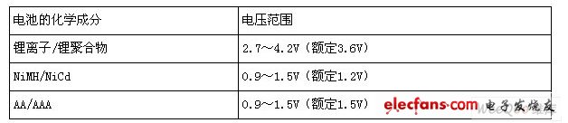 選擇輸入電壓范圍可以適應電源的LDO。下表列出了便攜式設備所采用的、流行的電池化學物質的電壓范圍。