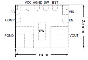 - 芯片采用小尺寸的QFN封裝,僅為3mm×2.5mm,功率密度極高,如圖2所示。