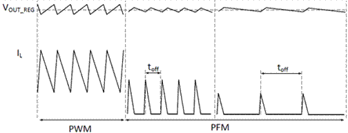 · 采用TI專利的SOO(平滑開通/關斷時間控制)技術,支持輕載時PWM模式到PFM模式的無縫過渡,實現全負載下無電壓漂移,滿足嚴苛的輸出電壓精度要求,并能通過延長關斷時間toff來大幅提升輕載效率,如圖3所示。