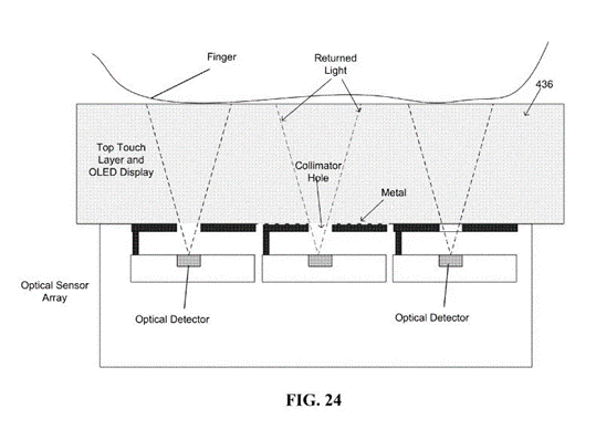 FIG.24 從微觀角度則說明了光線是如何穿透 OLED 屏幕的,最上面的就是手指;偏上這層灰色區域就是手機的屏幕部分。透過屏幕的小孔,匯頂稱之為“準直孔(Collimator Hole)”,手指反射回的光線光學傳感器搜集、處理。