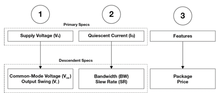 本文的目的是說明一種簡化的過程,該過程集中于選擇運(yùn)算放大器時(shí)的三個(gè)主要考慮因素,如圖1所示。前兩個(gè)考慮因素是電源電壓(Vs)和靜態(tài)電流(IQ)的主要規(guī)格)及其相應(yīng)的規(guī)范。次要規(guī)范定義為直接依賴于主要規(guī)范的規(guī)范。選擇一個(gè)沒有適當(dāng)?shù)闹饕?guī)格和次要規(guī)格的運(yùn)算放大器可能不適用于該應(yīng)用。第三個(gè)也是最后一個(gè)考慮因素涉