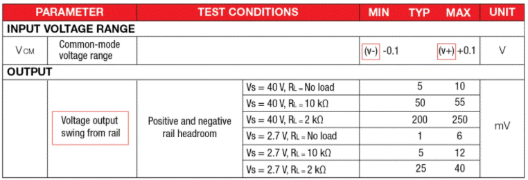 圖2在OPA991數(shù)據(jù)表的摘錄中,Vcm和Vo取決于電源電壓軌(V-和V +)。