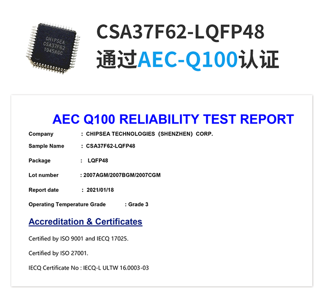 近日,芯海科技首個汽車電子項目CSA37F62-LQFP48成功通過AEC-Q100權威認證。