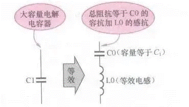 從等效電路中可以看出,串連一只等效電感L0,當(dāng)電解電容的容量越大時(shí),等效電感L0也越大,高頻特性越差。