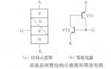 從等效電路中可以看出,普通晶閘管相當(dāng)于兩只三極管進(jìn)行一定方式的連接后的電路。