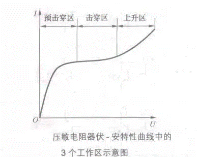 下圖是壓敏電阻器伏-安特性曲線中的3個(gè)工作區(qū)示意圖,它的3個(gè)工作區(qū)包括預(yù)擊穿區(qū)、擊穿區(qū)和上升區(qū)。