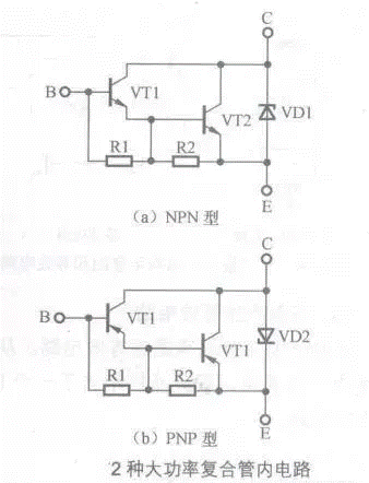 下圖所示是2種大功率復(fù)合管內(nèi)電路。從內(nèi)部電路中可以看出,它設(shè)有過(guò)電壓保護(hù)電路(采用穩(wěn)壓二極管)。