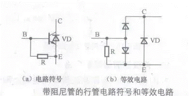 行輸出級(jí)電路中需要一只阻尼二極管,在一些行輸出三極管內(nèi)部設(shè)置了這一阻尼二極管,在行輸出管的電路符號(hào)中會(huì)表示出來(lái)。
