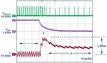 圖2.LTC3855限流與折返示例,在1.5 V/15 A供電軌上測量。