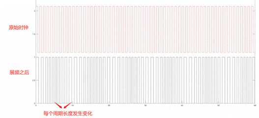 原本的時鐘信號每個周期都是一樣的,周期時間長度也一樣,為Tclk。我們可以對其進行微調,比如先將每個時鐘周期比上一個時鐘周期的時間加長一點點,累計n個周期之后,再將每個時鐘周期比上一個時鐘周期縮短一點點,再累計n個周期,如此循環。