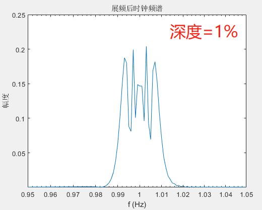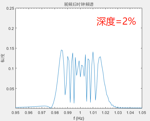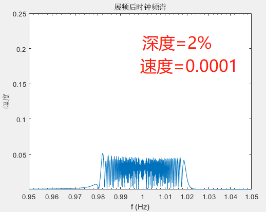 將調制速度從0.001改為0.0001,即降低10倍,調制深度為2%,頻譜如下圖。