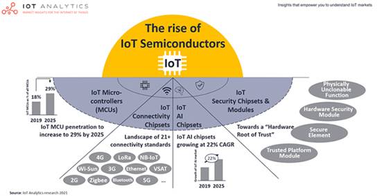當前的物聯網設備爆炸式增長將繼續推動物聯網半導體市場,并可能在產量提高的情況下進一步推動半導體創新。IoT Analytics關于此主題的最新報告預測,IoT半導體組件市場將從2020年的330億美元增長到2025年的800億美元,達到19%的復合年增長率。特別是,以下四個組件將成為人們關注的焦點:IoT微控制器(MCU),IoT連接芯片組,IoT AI芯片組以及IoT安全芯片組和模塊。