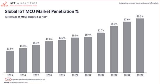借助這些趨勢,IoT Analytics預計IoT MCU在一般MCU市場中的滲透率將從2019年的18%增長到2025年的29%。特別是32位MCU,例如,眾所周知的Raspberry Pi代表了IoT應用的最佳選擇。