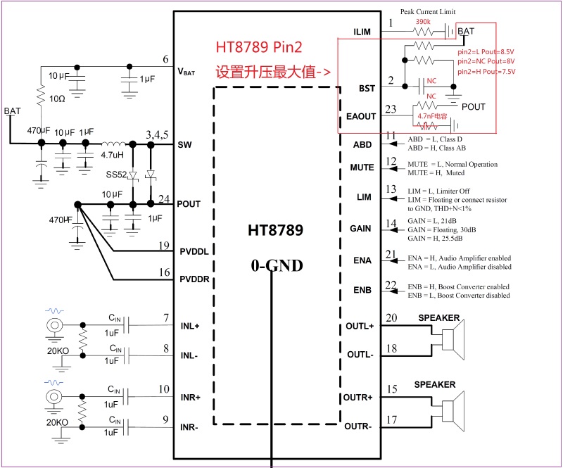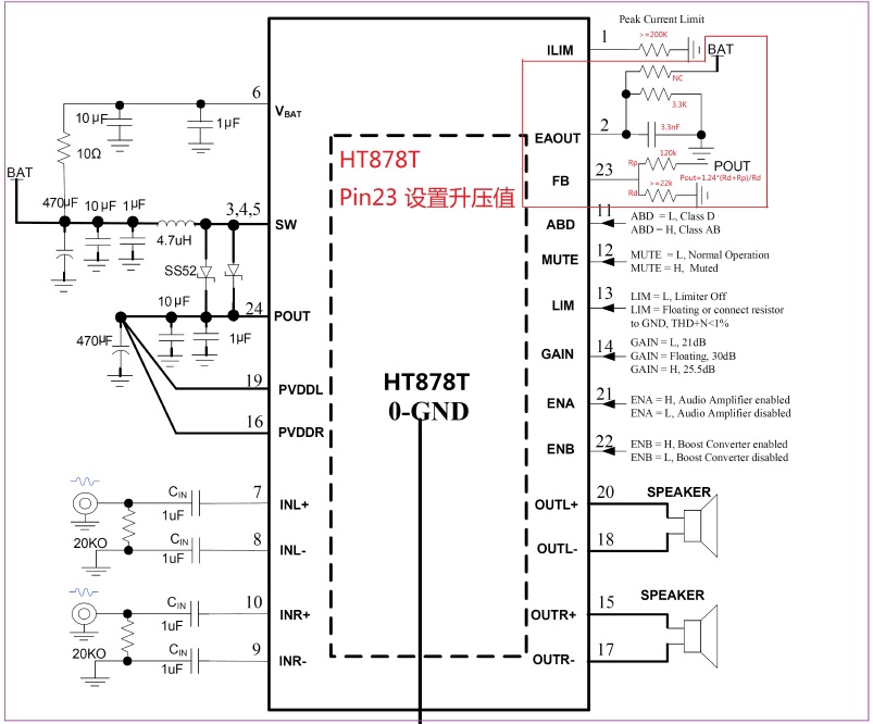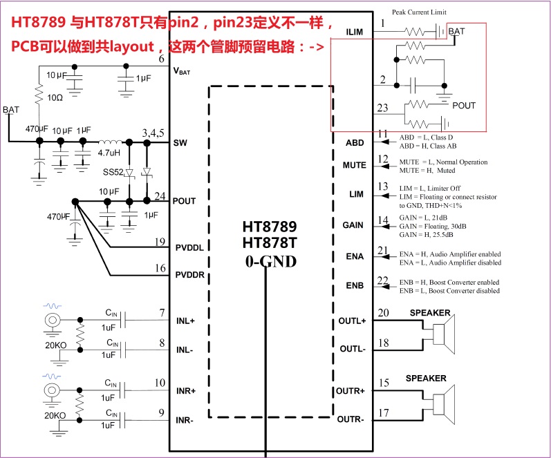 HT878 2X8.5W/2.7V-5.5V(內置自適應升壓模塊)/4Ω TSSOP-24 2.5V-5.5V 可任意限幅、單節鋰電池內置升壓的8W雙聲道音頻功放IC