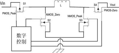 電感式結(jié)構(gòu)的主要貯能元件是電感,輸出電壓可以通過(guò)控制一個(gè)周期內(nèi)的充放電的占空比,來(lái)達(dá)到線性調(diào)節(jié),圖7所示為一個(gè)能夠自適應(yīng)實(shí)現(xiàn)升壓或降壓的拓?fù)浣Y(jié)構(gòu),它的工作原理是:(1)S1和S3閉合,升壓模式,電感兩端的電壓等于輸入電壓;(2)S1和S4閉合,前向?qū)J剑姼袃啥说碾妷旱扔谳斎腚妷簻p去輸出電壓;(3)S2和S4閉合,降壓模式,電感兩端的電壓等于反向輸出電壓。