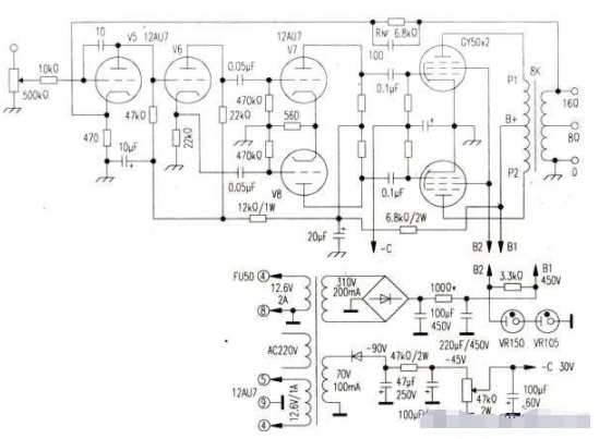 Gr50的第二柵極"采用充氣穩(wěn)壓管穩(wěn)壓供電,以保護(hù)Gr50。其中vr150可用國(guó)產(chǎn)WY-4P、蘇式Cr-4C代用,VR105可用WY-2P、蘇式Cr-2C代用。如果用半導(dǎo)體穩(wěn)壓管,需選用多只串聯(lián)組成250V穩(wěn)壓電路,最大齊納電流不小于45mA。AB1類固定柵負(fù)壓無(wú)負(fù)載電流,可用大電阻、電容濾波,該機(jī)中濾波電阻47kΩ和50kΩ電位器兼作分壓器,使電位器兩端有-45V左右負(fù)電壓調(diào)整于-30V,使Gr50兩管靜態(tài)陰極電流(P+G2電流之和)為140mA。