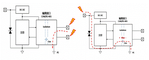 當(dāng)總線側(cè)接口受到靜電放電時,靜電能量通過隔離接口模塊內(nèi)部總線側(cè)器件泄放至PE,但若ESD能量超出了接口模塊內(nèi)部總線側(cè)器件的ESD抗擾能力,總線接口則可能損壞,如下面左圖;