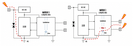假設(shè)控制側(cè)均做了足夠的保護措施,當(dāng)控制側(cè)接口受到靜電放電時,能量通過控制側(cè)保護器泄放至PE,對隔離通信接口基本無影響,如下面左圖;
