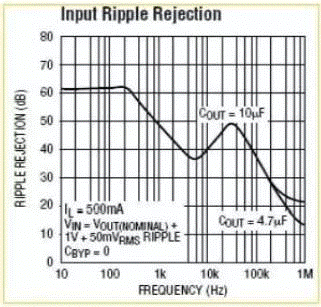任何一款LDO都有一項指標:噪音抑制比。是一條頻率-dB曲線,如右圖是凌特公司LT3024的曲線。