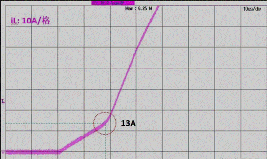 8、測量電感電流波形的拐點位置,即約為電感的飽和電流。圖2中,拐點位置約為13A,電感的飽和電流約為13A。