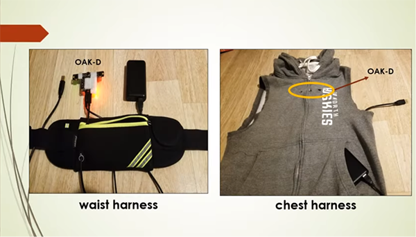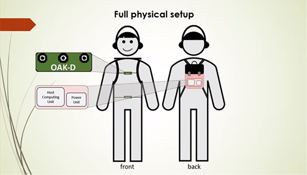 這個系統(tǒng)位于一個小巧的背包內(nèi),其中包含一個主機計算裝置,就像一個筆記本電腦。攝像頭隱藏在馬甲外套中,一個口袋大小的電池包放在腰包中,能夠提供使用大約8個小時的電力。一個Luxonis OAK-D空間人工智能攝像頭可以黏貼在馬甲或腰包上,然后連接到背包中的計算裝置。馬甲上有三個放置OAK-D攝像頭的小孔,而攝像頭則位于馬甲內(nèi)側(cè)。