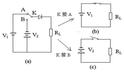 當開關K打向A時,二極管處于正向,電流很大,相當于接有負載的外回路與電源相連的開關閉合,回路處于接通狀態(開態);