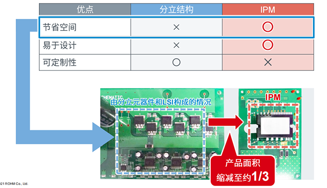 IPM即智能功率模塊,與普通功率模塊相比,IPM可以將功率器件集成在一個(gè)封裝器件中,同時(shí)還可以把相應(yīng)的驅(qū)動(dòng)電路以及周邊的保護(hù)電路全部集成到模塊里,幫助工程師簡(jiǎn)化產(chǎn)品設(shè)計(jì)。以空調(diào)電機(jī)的壓縮機(jī)控制板為例,從圖中可以看出,左側(cè)藍(lán)色邊框內(nèi)的部分是以往的功率驅(qū)動(dòng)板,將功率器件、驅(qū)動(dòng)電路和電流檢測(cè)保護(hù)電路分布在板子上,完成一個(gè)功率轉(zhuǎn)換的電路。相比右側(cè)而言,IPM完全取代這些器件,既易于設(shè)計(jì),又可以將產(chǎn)品面積縮減至三分之一。盡管在一些性能指標(biāo)的對(duì)應(yīng)上面,分離器件可以更靈活的對(duì)外圍器件做調(diào)整,但隨著IPM現(xiàn)在性能越來(lái)越可靠,應(yīng)用越來(lái)越適用,調(diào)整電路的要求逐步弱化。