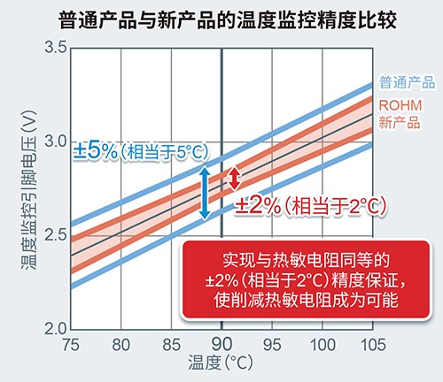 相比普通產(chǎn)品±5%(相當(dāng)于5℃)(90℃時(shí))的溫度監(jiān)控功能保證,新產(chǎn)品的精度大大改善,可達(dá)到與熱敏電阻同等的保證精度±2%(相當(dāng)于2℃)(同樣90℃時(shí))。這使得削減以往高精度溫度監(jiān)控器所需的外置熱敏電阻數(shù)量成為可能,從而有助于減少元器件數(shù)量和設(shè)計(jì)工時(shí)。