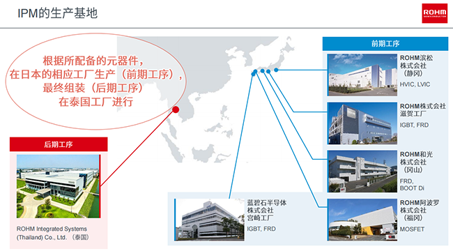 IPM作為一個(gè)功率模塊,里面包含很多的功率器件,ROHM所有的功率器件,包括前端,從晶圓到裸片的開(kāi)發(fā),都是在日本的工廠完成。完成后,會(huì)送到泰國(guó)工廠做后續(xù)的封裝以及測(cè)試的工作。完成封裝、測(cè)試以后,然后再做全球的出貨、統(tǒng)配工作,可以說(shuō)所有產(chǎn)品保障都是由ROHM公司內(nèi)部完成。