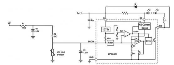 大多數(shù)汽車LED驅(qū)動(dòng)器都具有電流調(diào)光功能。但是,調(diào)光控制電路通常通過(guò)復(fù)雜的模擬或數(shù)字電路來(lái)控制,這在最終應(yīng)用中通常會(huì)占用大量空間,并增加整個(gè)系統(tǒng)成本。本文提出了一種基于NTC電阻(負(fù)溫度系數(shù))的簡(jiǎn)單電路解決方案,該解決方案可根據(jù)溫度線性調(diào)節(jié)輸出電流。