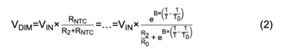 Steinhart-Hart方程表明溫度與NTC電阻值之間的關(guān)系是非線性的,因此電阻分壓器與溫度也具有非線性關(guān)系。因此,由于溫度引起的電流減小也是非線性的。可以使用公式2估算這種下降: