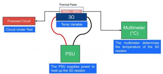 為了測(cè)試電路性能,構(gòu)建了一個(gè)系統(tǒng)來(lái)模擬現(xiàn)實(shí)世界的用例(圖4)。 一個(gè)3Ω電阻替代LED,該電阻通過(guò)在兩極之間施加電壓差來(lái)加熱。然后,選擇的NTC是用導(dǎo)熱膏固定在電阻器上,以確保最大程度地準(zhǔn)確地檢測(cè)電阻器/溫度。最后,NTC連接到設(shè)計(jì)的電路。通過(guò)改變電阻器的溫度(掃描提供給它的功率),獲得了DIM電壓曲線。