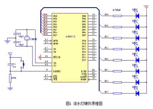 當今時代是一個新技術層出不窮的時代,在電子領域尤其是自動化智能控制領域,傳統的分立元件或數字邏輯電路構成的控制系統,正以前所未見的速度被單片機智能控制系統所取代。單片機具有體積小、功能強、成本低、應用面廣等優點,可以說,智能控制與自動控制的核心就是單片機。目前,一個學習與應用單片機的高潮正在工廠、學校及企事業單位大規模地興起。學習單片機的最有效方法就是理論與實踐并重,本文筆者用AT89C51單片機自制了一款簡易的流水燈,重點介紹了其軟件編程方法,以期給單片機初學者以啟發,更快地成為單片機領域的優秀人才。